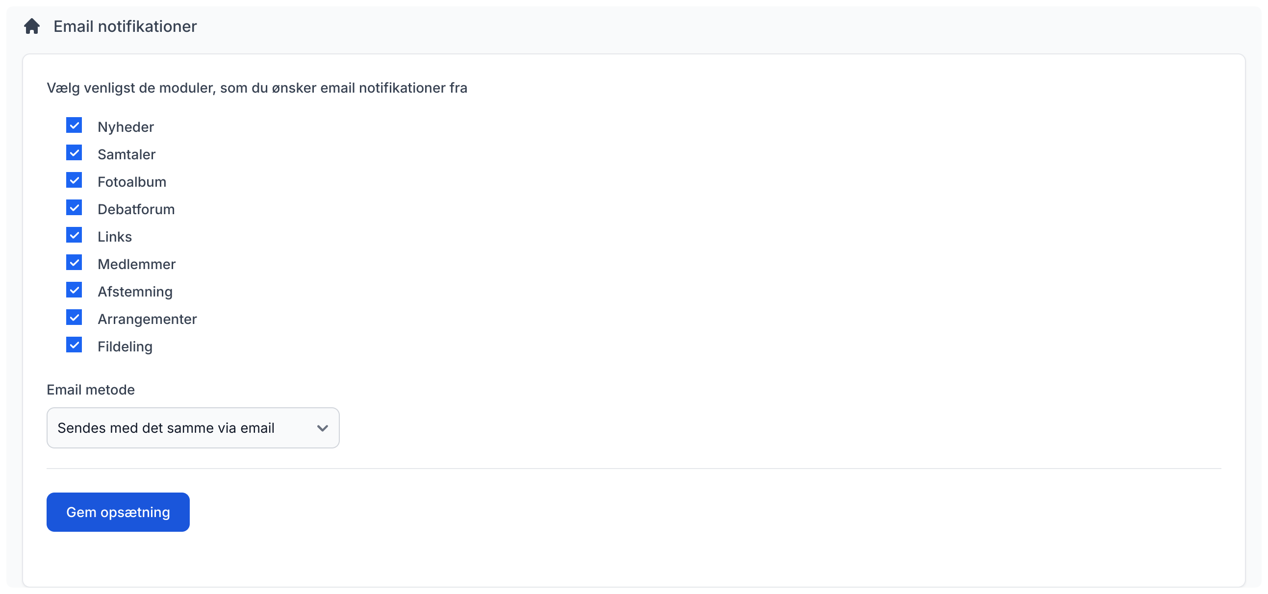 iGroups er meget fleksibel med hvordan du ønsker at blive notificeret, når der sker nye ting i den iGroup. Standard modtager man en email, hver gang der er sket nye ting. Der kan dog være grunde til at man ikke ønskes at modtage disse, så dette kan vælges/fravælges på denne side.